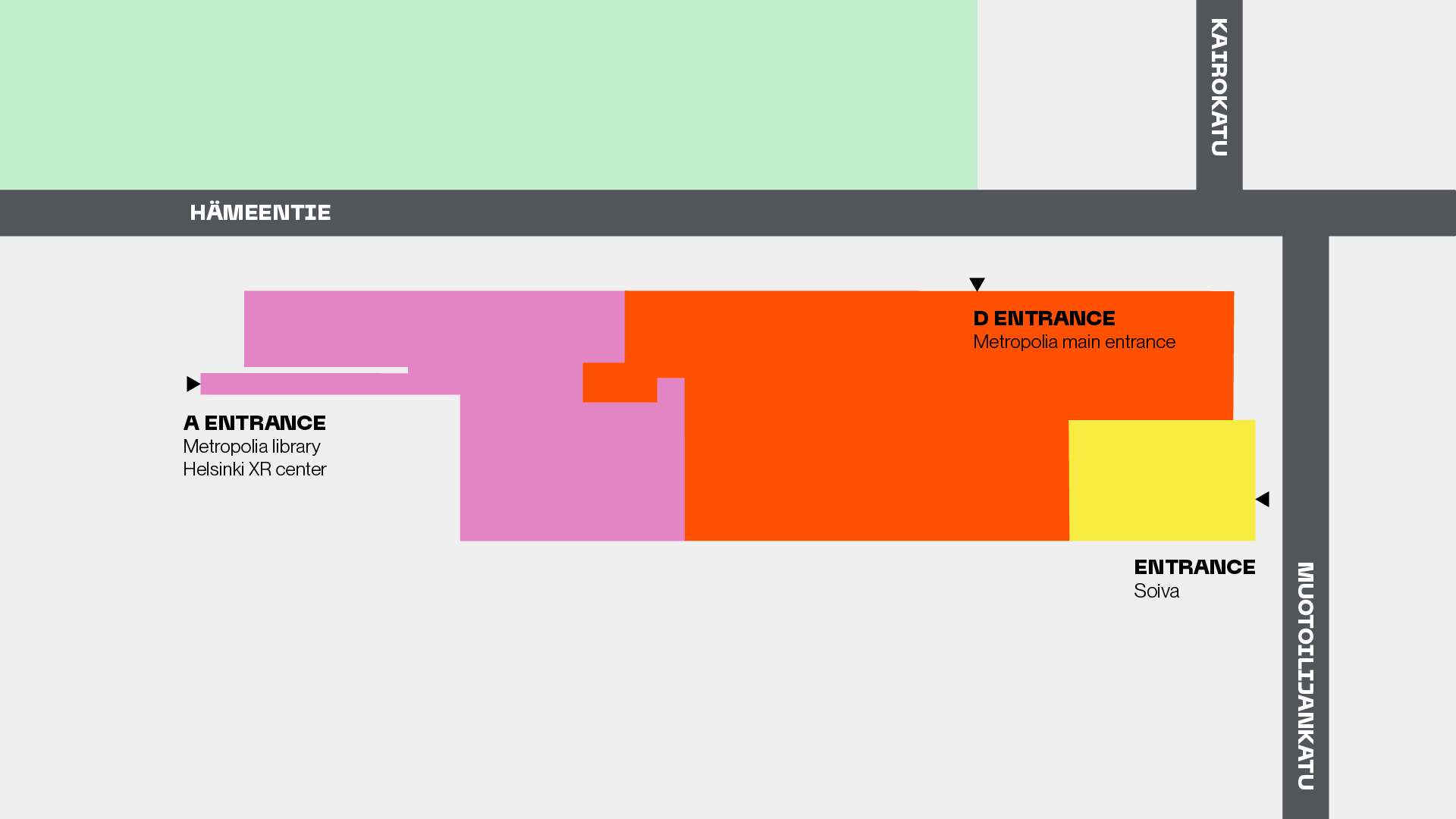 Arabia Campus is located in the Arabia135 block in Arabianranta, Helsinki, along Hämeentie, between Arabiankatu and Muotoilijankatu. The address of the main entrance is Hämeentie 135 D, Helsinki. You can access the Metropolia library and the Helsinki XR Center through the A entrance of the block. The entrance to Soiva is on the Muotoilijankatu side. The floor plan of the campus can be found in the sign board on the campus and on Oma-intranet.