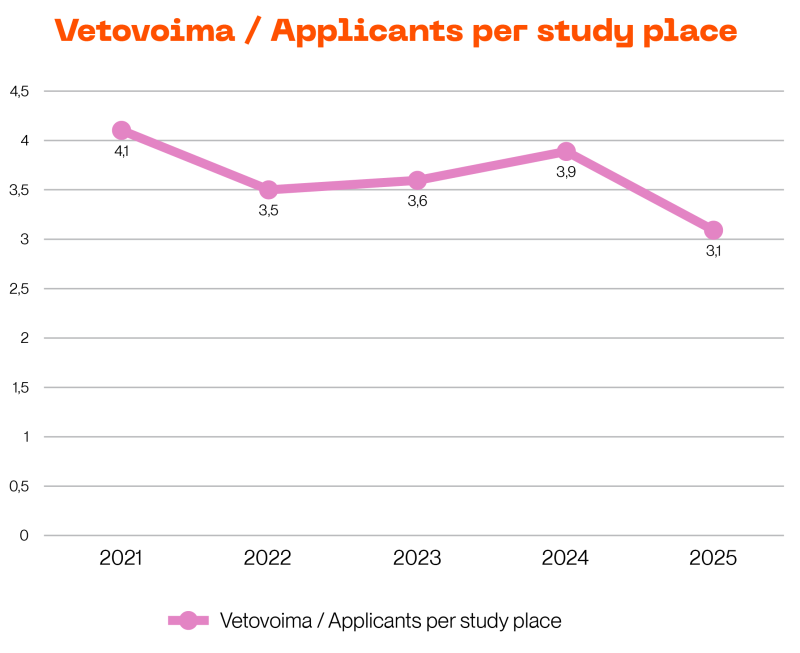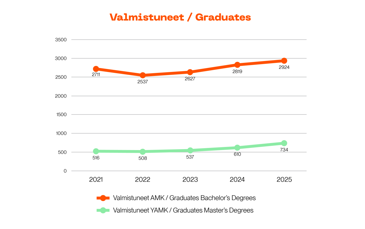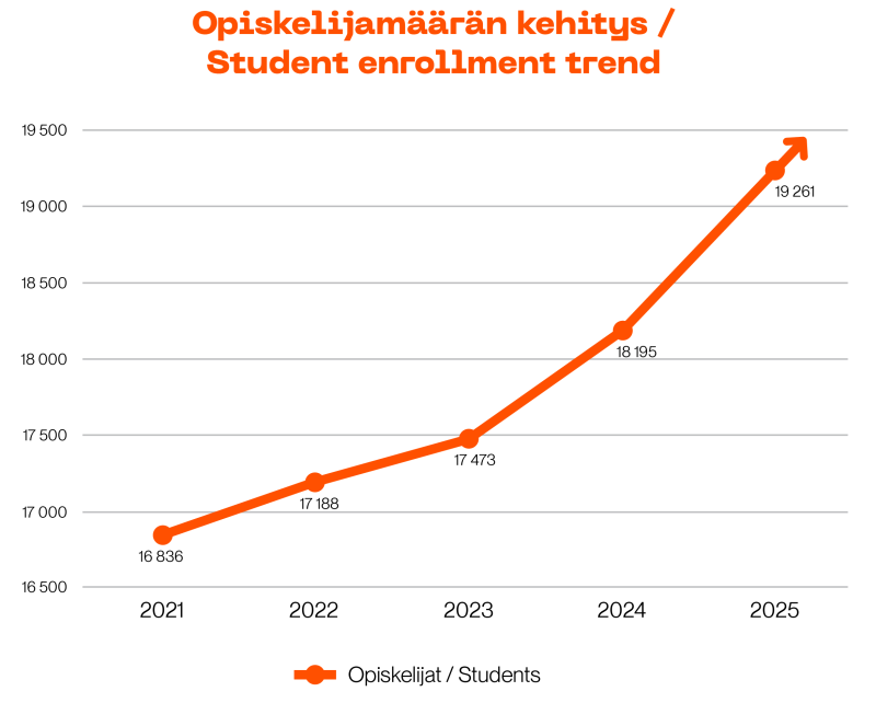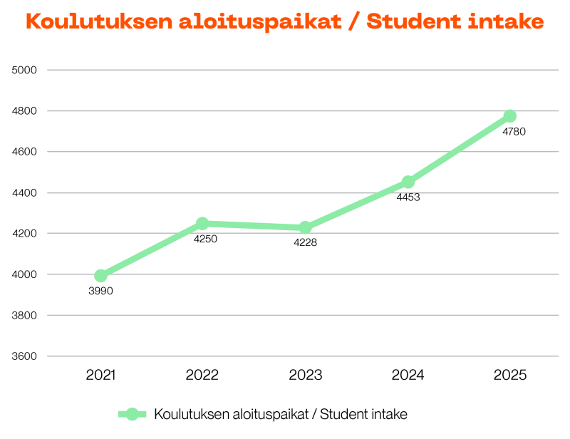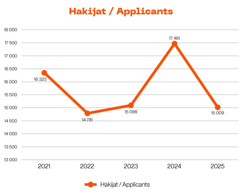 In 2025, Metropolia received a total of 15,009 primary applicants for its bachelor’s and master’s degree programmes (2024: 17,461; 2023: 15,098; 2022: 14,781), and there were 4,780 study places available (2024: 4,453; 2023: 4,228; 2022: 4,250). In 2025, Metropolia’s attraction rate (eligible primary applicants per study place) was 3.1 (2024: 3.9; 2023: 3.6; 2022: 3.48).